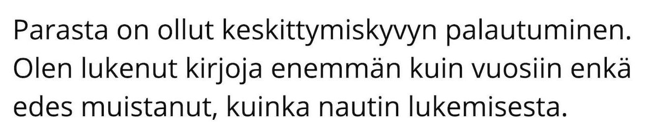 "Parasta oli lyhyet helposti tehtävät harjoitukset. Teen näitä uudestaan, että pysähtymisestä ja pienestä tauosta tulee tapa."